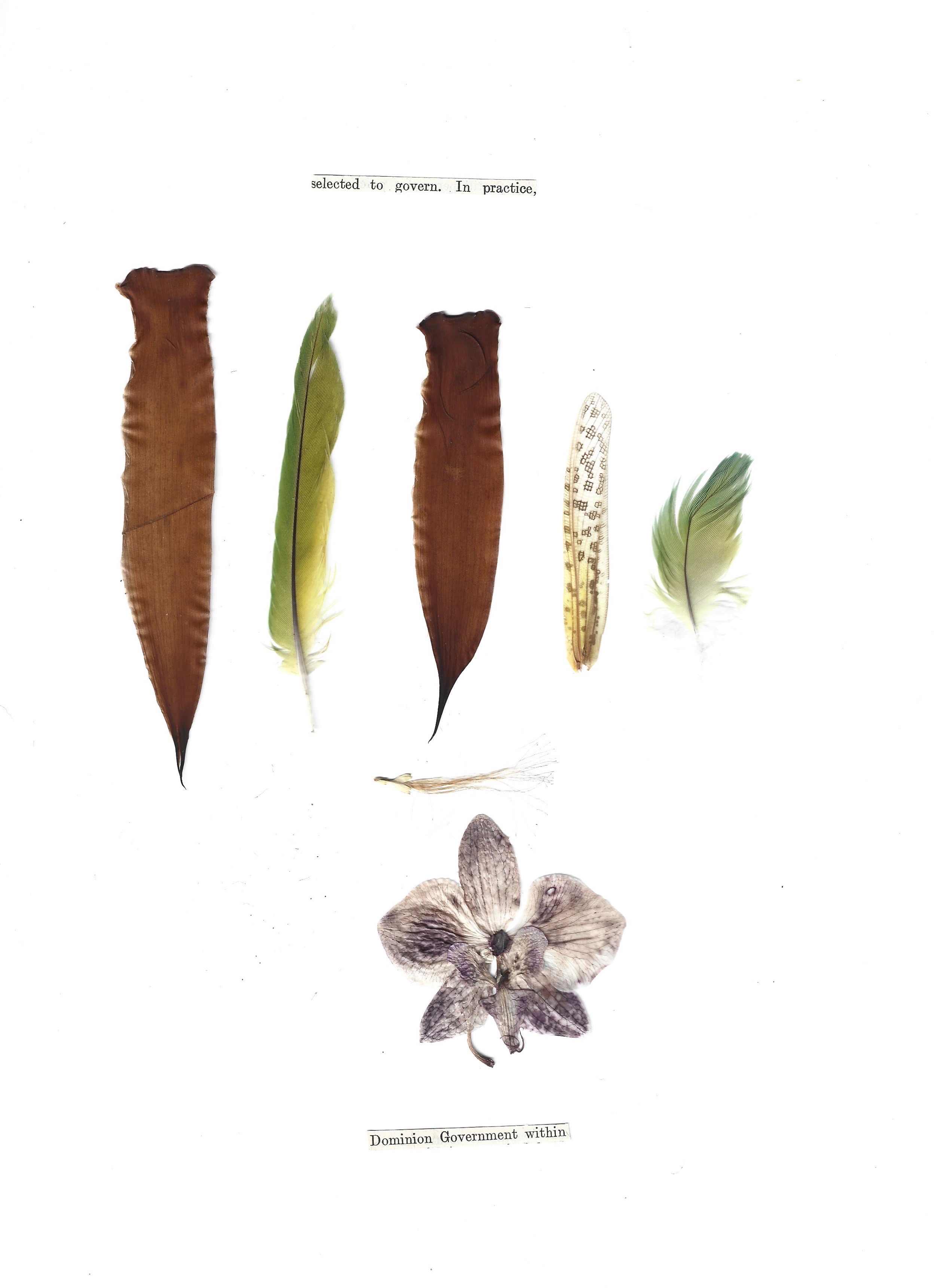 Workspace tableau – erasure poetry in British Colonial Policy 1763–1917, 2022. Botanical drawing of poppy bud and herbarium fragments.